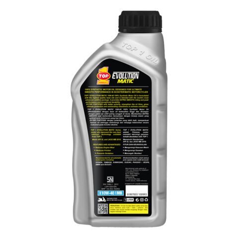 TOP 1 EVOLUTION MATIC 10W-40 100% Synthetic Motor Oil diformulasikan dengan base oil berkualitas tinggi dan dicampur dengan paket zat aditif paling canggih di dunia. Memberikan EXTRA SMOOTH saat berkendara bersamaan dengan kinerja mesin yang optimal serta ketahanan yang luar biasa. ESTER FORTIFIED dengan polaritas yang lebih baik, memperkuat lapisan oli sehingga melindungi dan menjaga kebersihan secara maksimal pada kondisi ekstrim Memenuhi Standarisasi API SL & JASO MB.TEKNOLOGI