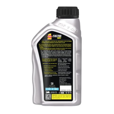 TOP 1 EVOLUTION MC 100% Synthetic Motor Oil diformulasikan dengan base oil berkualitas tinggi dan dicampur dengan paket zat aditif paling canggih di dunia. Memberikan EXTRA POWER saat berkendara bersamaan dengan kinerja mesin yang optimal dan ketahanan luar biasa. ESTER FORTIFIED dengan polaritas yang lebih baik, memperkuat lapisan oli sehingga melindungi dan menjaga kebersihan secara maksimal pada kondisi ekstrim. Memenuhi Standarisasi API SL & JASO MA 2TEKNOLOGI