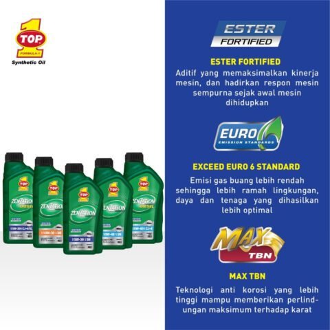 TOP1 1 ZENZATION Synthetic Motor Oil dengan ESTER FORTIFIED diformulasikan khusus untuk perlindungan luar biasa dengan polaritas lebih baik memberikan lapisan film oli lebih kuat, mengurangi keausan, gesekan mesin. Dipadukan dengan TBN yang tinggi memberikan perlindungan terhadap karat serta mencegah pembentukan kotoran.