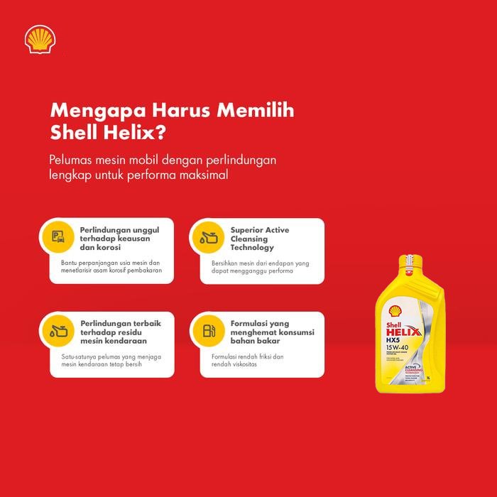 Shell Helix HX5 15W-40 adalah pelumas mesin mobil premium dengan tingkat kekentalan ganda untuk membantu membersihkan endapan mesin dan mengembalikan performa maksimalnya.
