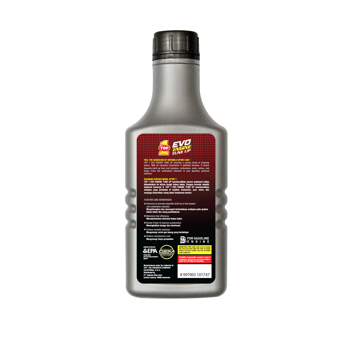 TOP 1 EVO ENGINE TUNE UP fuel system treatment diformulasikan dengan Teknologi Aditif GENERASI IV, teknologi canggih untuk meningkatkan tenaga dan mengurangi emisi berbahaya. Produk ini dirancang untuk membersihkan dan merawat seluruh sistem bahan bakar kendaraan Anda serta meningkatkan performa. Satu kali penggunaan TOP 1 EVO ENGINE TUNE UP dapat membersihkan seluruh sistem bahan bakar, termasuk: injektor bahan bakar, karburator, katup masuk, dan manifold masuk. Penggunaan yang sama juga dapat menjaga ruang bakar tetap bersih.