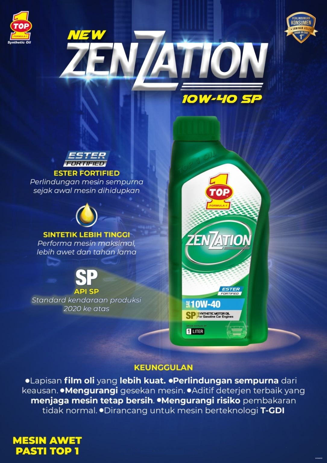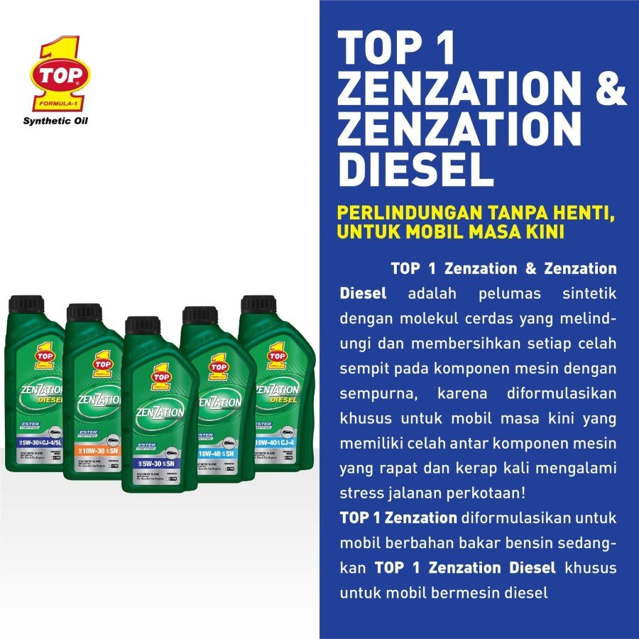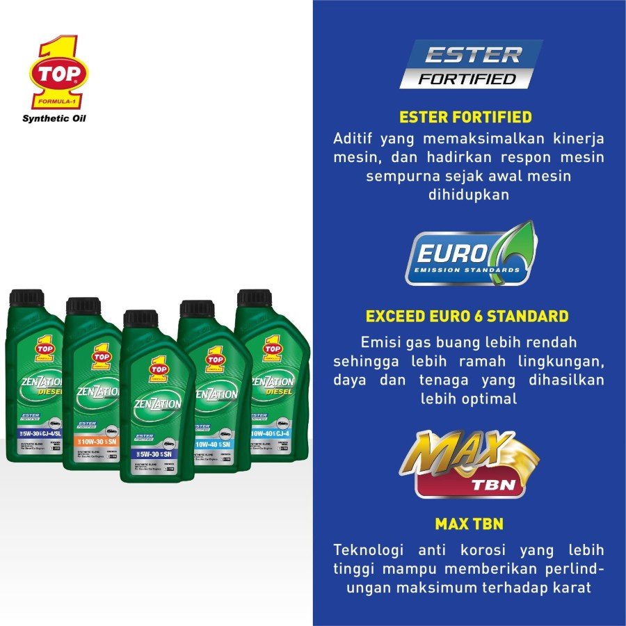 TOP 1 ZENZATION Synthetic Motor Oil dengan ESTER FORTIFIED memastikan performa terbaik oli pada mesin kendaraan. Polaritas yang lebih baik memperkuat lapisan film oli untuk perlindungan maksimal terhadap keausan mesin, pembentukkan kotoran dan oksidasi sejak mesin pertama di hidupkan.